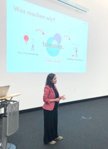 Aus dem Gründerinnenzentrum Dortmund präsentierte sich Susana Spyrka, Inhaberin der Beratungsagentur Tumana. Sie unterstützt Unternehmen bei der Lösung komplexer Fragestellungen durch Service Design, UX Design und agile Methoden. Mit über acht Jahren Erfahrung in der digitalen Transformation fokussiert sie sich auf nutzerzentrierte Lösungen und die Stärkung von Teams. Hier finden Sie mehr Informationen.
